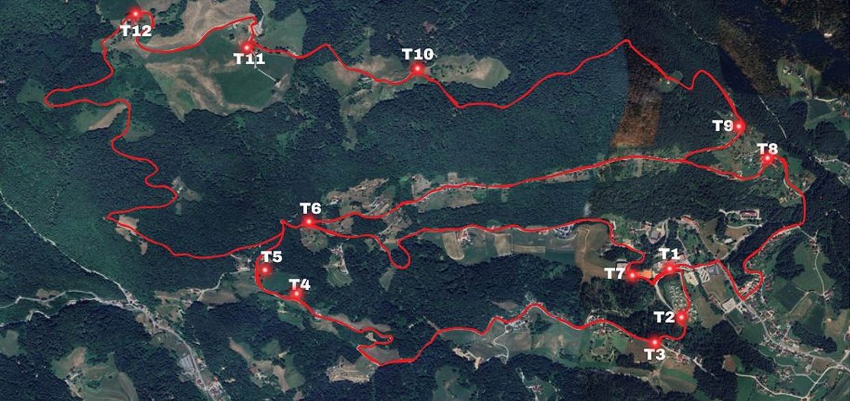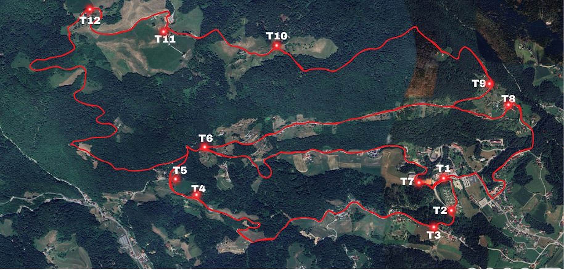 Vsaka trasa je tako opisana kot zaporedje teh točk (npr. T1–T5–T7–T1), kar pomeni, da sledite poti od ene označene točke do druge in se na koncu vrnete na izhodišče.